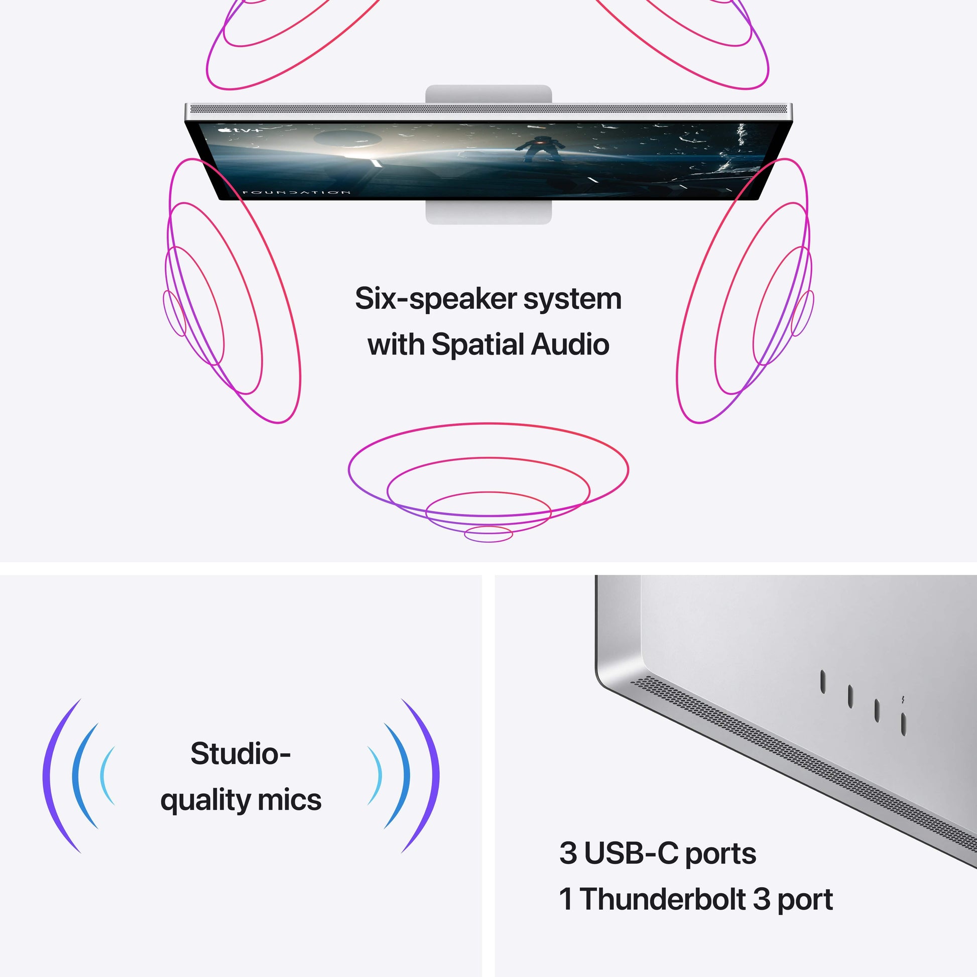 Display Retina 5K da 27 pollici. Fotocamera Ultra-grandangolare da 12 MP con Centre Stage. Microfoni di qualità da studio. Sistema audio a sei altoparlanti con Spatial Audio.